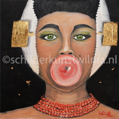 Prachtige reproductie van het originele olieverfschilderij "Zeeuwse boerin blaastkaugombubbel" van Wilma. Opvallend zijn de prachtige gedetails op de haring.