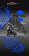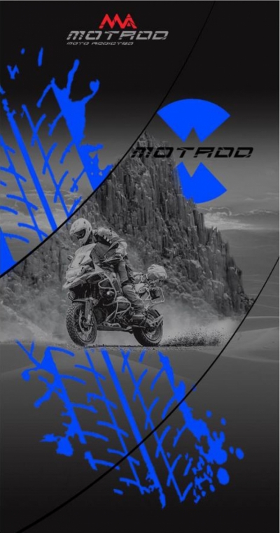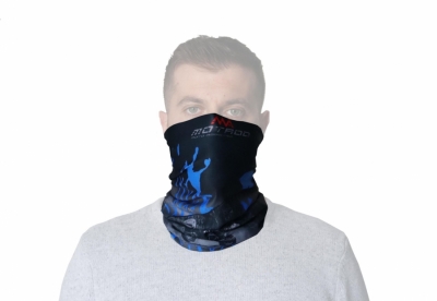 Buff met mooie avontuurlijke print van een BMW GSA LC offroad, met de kelur Rallye of HP blauw. Zit prima, door de ruime stretchk marge.