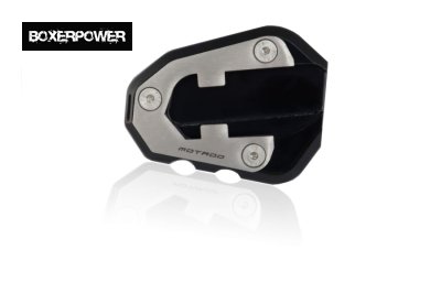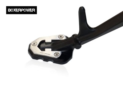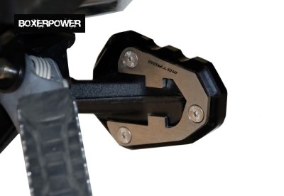 Door het kleine contactoppervlak van de originele zijstandaard / jiffy / zijpikkel / cameltoe bestaat het gevaar dat deze langzaam en vaak ongemerkt wegzakt, zowel op hete geasfalteerde oppervlakken als op licht zachte onstabiele ondergrond, grind / grond / gras. Een nauwkeurig gevormde steunvergroting, die eenvoudig op de zijstandaard wordt geschroefd, kan dit gevaar aanzienlijk verkleinen. En om de kickstand gemakkelijk met de hak van de laars uit te klappen, hebben we een externe vertanding aangebracht. Italiaans design, uitgevoerd in zwart en RVS.