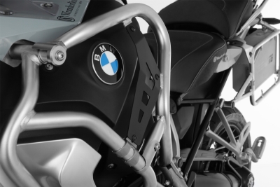 The harmoniously designed aluminium plating forms a triangle in the space between our reinforcement bar 41873-200 and the Adventure tank protection bar, making sure not to cover up the BMW brand emblem on the tank. The technical aesthetics emphasise the structure of the protection bar and also incidentally add to structural stability. You can order it separately in black (item no. 41874-102) or silver (item no. 41874-101).