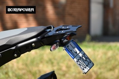 With our complete kit it is possible to replace the standard rear mudguard/license plate holder with an extremely more compact structure and with a decidedly sporty look, in full compliance with current regulations (30° approved inclination). In addition to this, the kit includes a very sturdy luggage rack plate, equipped with a right+left base fixed directly to the motorbike frame, it has been specifically designed with the aim of centralizing all the masses. This translates into greater stability and agility of the bike and less load transfer during braking and acceleration. The structure includes two solid and robust ergonomic handles which are extremely useful when moving the motorbike from a standstill.