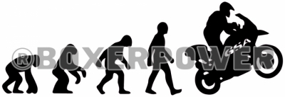 Computergesneden sticker, kleur zwart, met in stripvorm de evoluitie van een oermens tot een GSA rijder