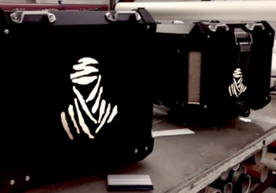 Hoogwaardige ZWARTE, maar in donker WIT reflecterende sticker met afbeelding TOUAREG of NOMAD en tekst DAKAR.