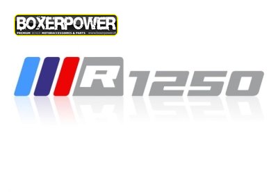 Een sticker met de type-aanduiding R1250 met in streepvorm de M-kleuren. Basiskleur silver metallic