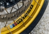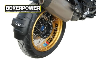 Een sticker met de type-aanduiding R1250 met in streepvorm de M-kleuren.