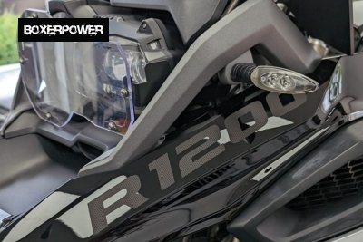 Speciaal op maat gesneden type-aanduiding R1250 voor de zijkanten van de snavel van  de BMW R1250GS LC en BMW R1250 GSA (2013-2023).  De type-aanduiding, die uitgevoers is in een speciale 3M folie geeft een bijzonder effect, vooral op een donkere kleur komt de matte hexagon matrix structuur / reliëf heel goed tot zijn recht. Wordt geleverd als set van twee, voorzien van montagefolie en montage-instructie via QR-code.