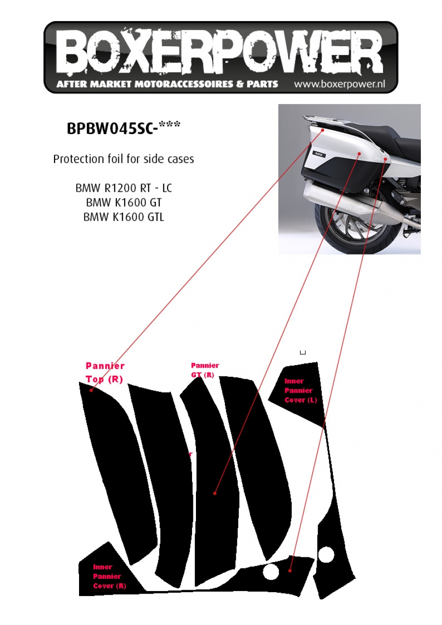 Boxerpower 3M Scotchgard Paint Protection Foil PRO SERIES® / (Ventureshield *) lakbescherming kant en klaar set. Speciaal op maat gesneden kit voor de voorzijde, zijkanten en bovenzijde van de zijkoffers van de K1600GT/K1600GTL/R1200RT LC.