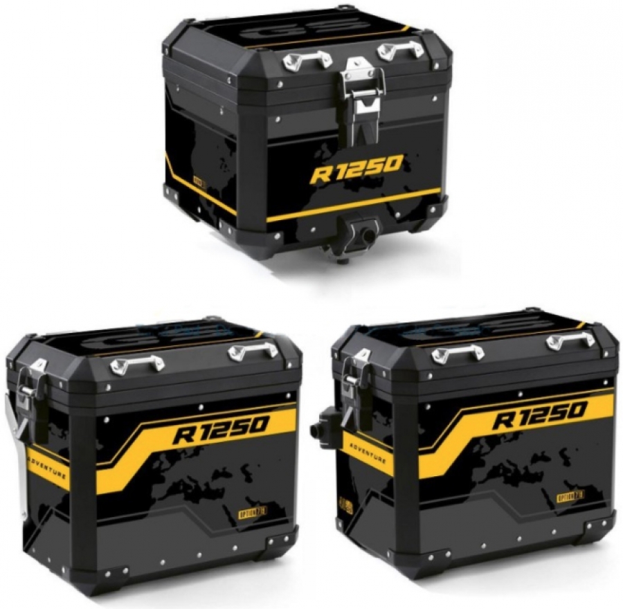 BMW R1250 GSA Option 719 style koffer sticker set, kleuren: zwart en geel; OPTION 719 Style en 40 Years GS Style.