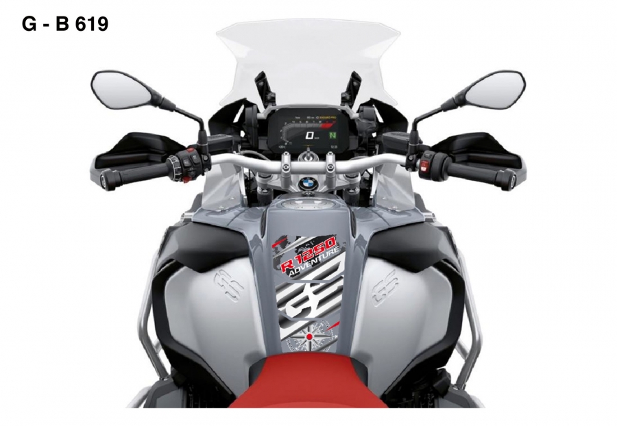 Tankpad / Protector BMW R1250GSA Wit met de letters GS, tekst R1250 Adventure en kompas.