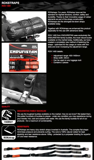 ROKstraps: For years, ROKstrap have set the standard for highest tensions, comfort, safety and durability. Thanks to their innovative usage of rubber elements as part of the straps construction, ROKstraps are the strongest tie-down straps available today. Together with ROKstraps we enhanced this product especially for the use with adventure bikes. ROK 1400 from ENDURISTAN uses exclusively the ENDURISTAN family buckles, the most robust buckle available on the market today. Additionally, we have created a completely new method of fastening the straps - optimised for the usage on racks with thin slots and even increasing the adjustment range. ROK 1400 details: